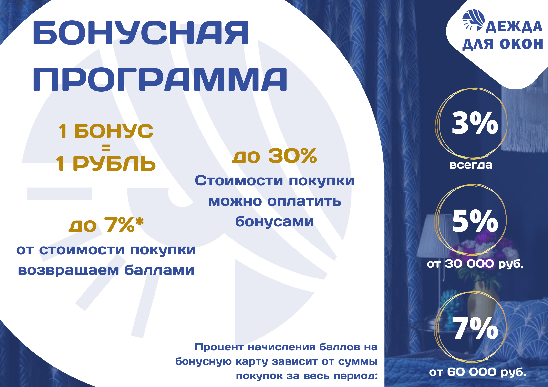 Она актуальна для тех, кто занимается украшением своего жилища постепенно, комната за комнатой. А еще очень приятно возвращаться в места, где тебя ждет постоянная персональная скидка. Для этого у нас есть бонусная карта. Делая любую покупку вы получаете кэшбек 3% . Как только сумма Ваших покупок за весь период пользования картой превысит 30000 рублей, кэшбек составит 5%. А от 60000 рублей 7%. Стоимость карты всего 25 рублей. Ее можно передавать близким и друзьям. 1 балл равен рублю. Баллы не сгорают. Ими можно оплатить 30% стоимости покупки. Карту можно передавать